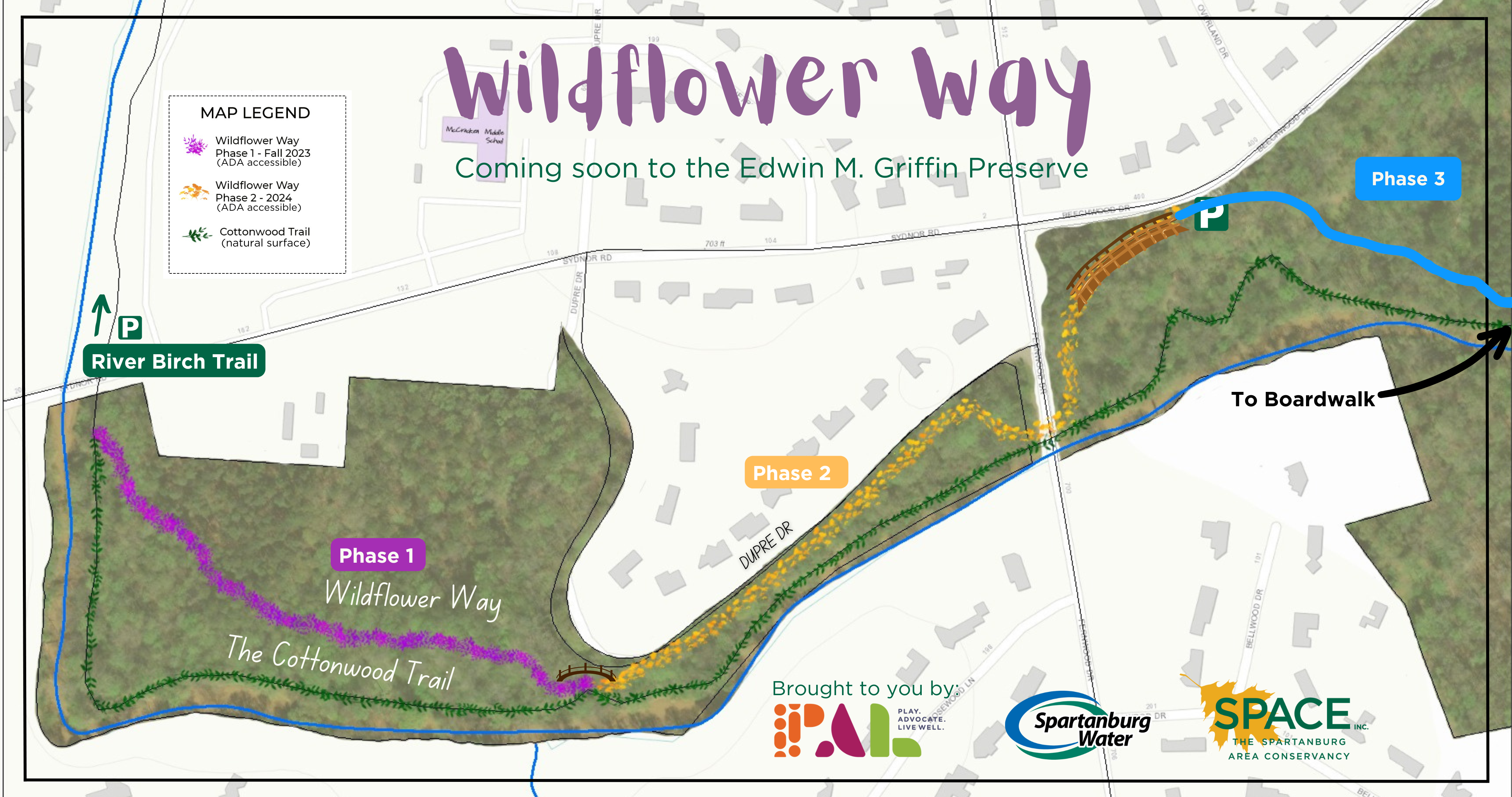 Wildflower Way is a paved trail that runs parallel to the Cottonwood Trail, which is managed by SPACE and the City of Spartanburg. While Cottonwood offers a natural-surface path, Wildflower Way provides a smooth, paved option—making this treasured landscape more welcoming to people using strollers, wheelchairs, mobility aids, and anyone who prefers an easier surface.
